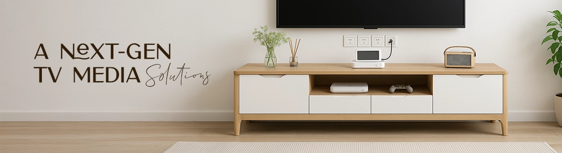 وحدة تلفاز من الخشب الطبيعي بتصميم انسيابي تضيف دفء الطبيعة ومساحة تخزين منظمة إلى غرفة المعيشة.