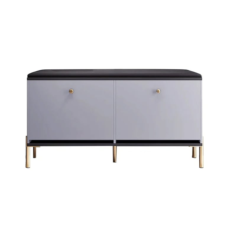مقعد تخزين أنيق بتصميم عصري يجمع بين الخشب الطبيعي والوسادة المبطنة، مدعّم بأرجل معدنية ذهبية تضيف لمسة فخامة، مع درجين عمليين لتنظيم الأغراض.
