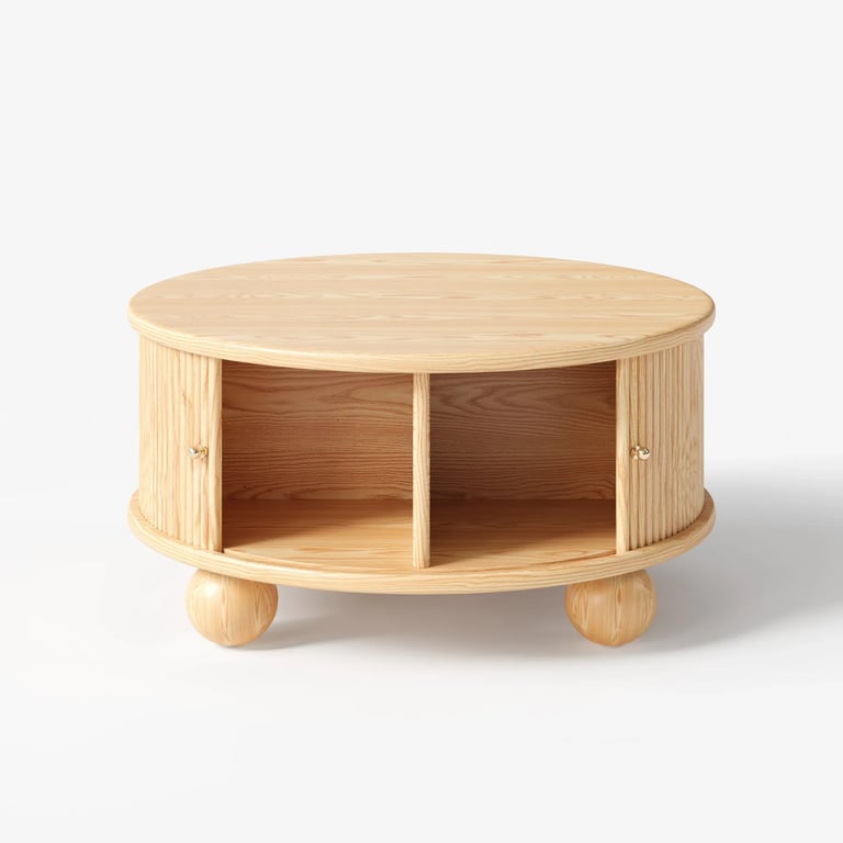 طاولة قهوة دائرية بتصميم أنيق مصنوع من الخشب الطبيعي، تجمع بين الشكل العصري ومساحات التخزين العملية، مع أبواب منزلقة تضيف سهولة استخدام ولمسة منظمة لغرفة المعيشة.