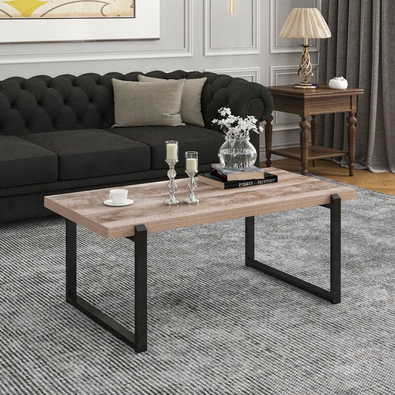 طاولة قهوة أنيقة بسطح من الخشب الطبيعي وهيكل معدني أسود غير لامع — تجمع بين التصميم العصري والمتانة اليومية مع مساحة تخزين مفتوحة عملية.