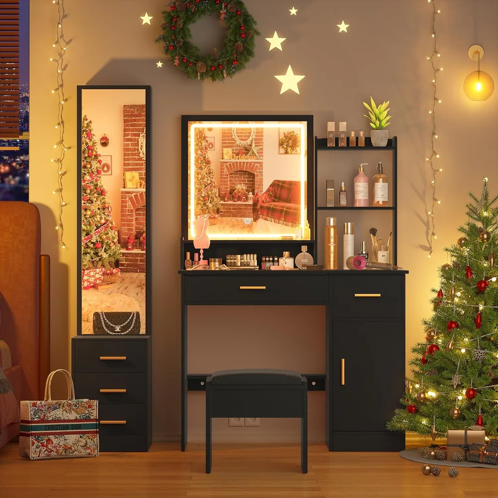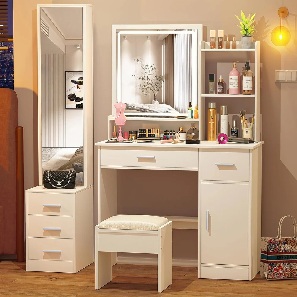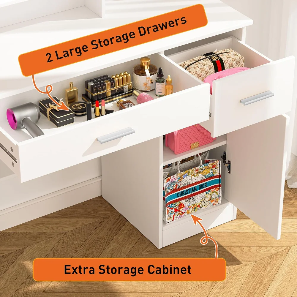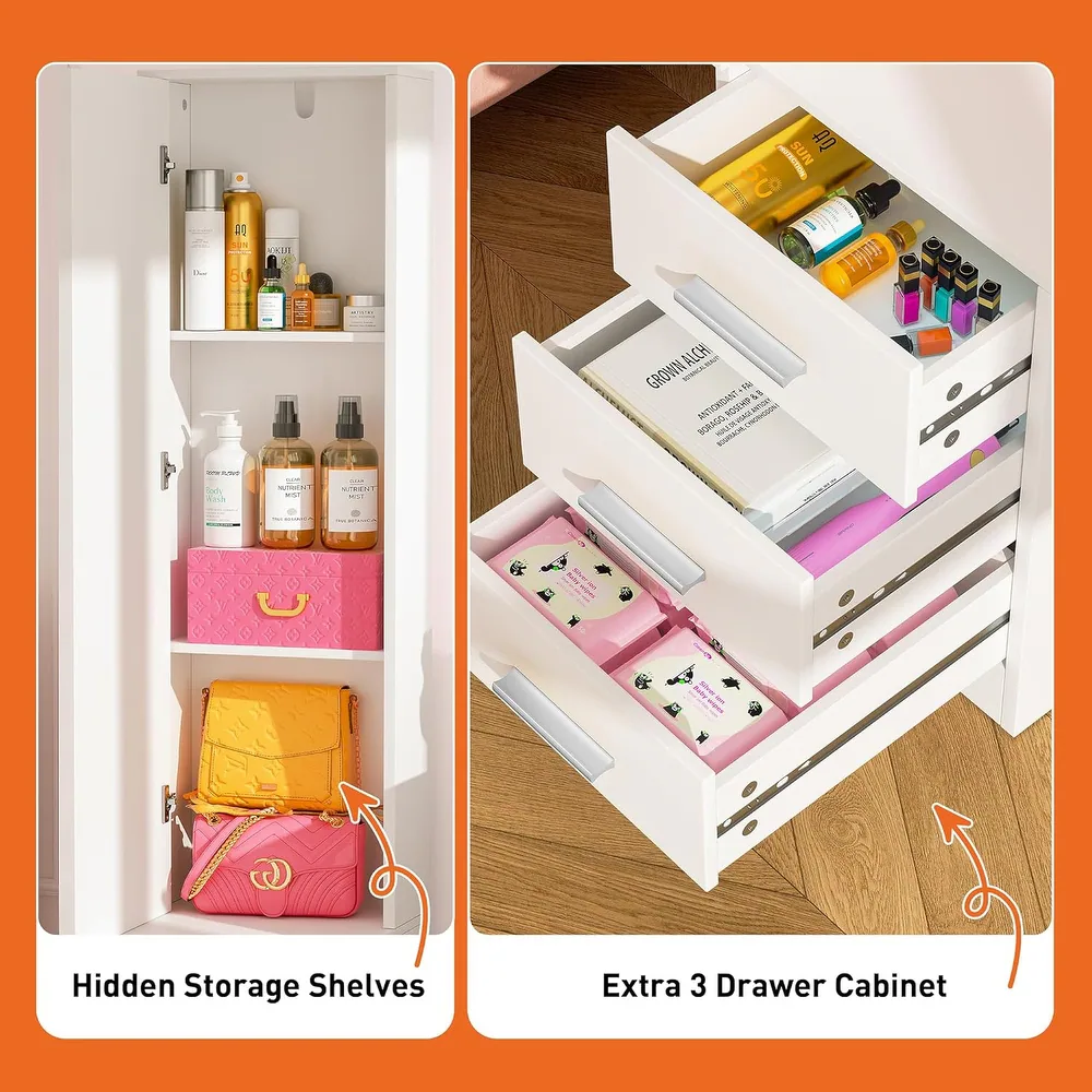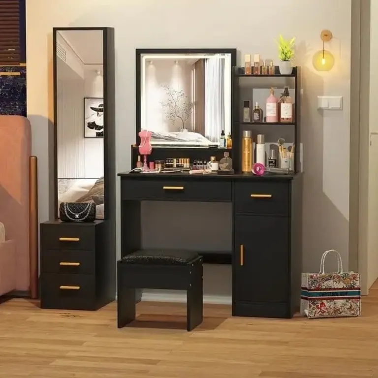 تتكون من 5 أدراج و دولاب تخزين و رفوف مفتوحة، وطاولة واسعة، مما يوفر مساحة تخزين كبيرة للمجوهرات، وإكسسوارات الشعر، والمكياج، والمزيد.