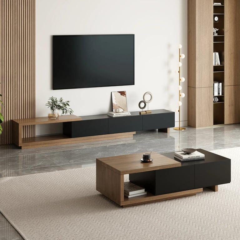 طقم طاولة قهوة وطاولة تلفاز أنيق مصنوع من الخشب الطبيعي مع لمسات سوداء جريئة – مصمم لمقاومة الماء والتشقق والحشرات.
