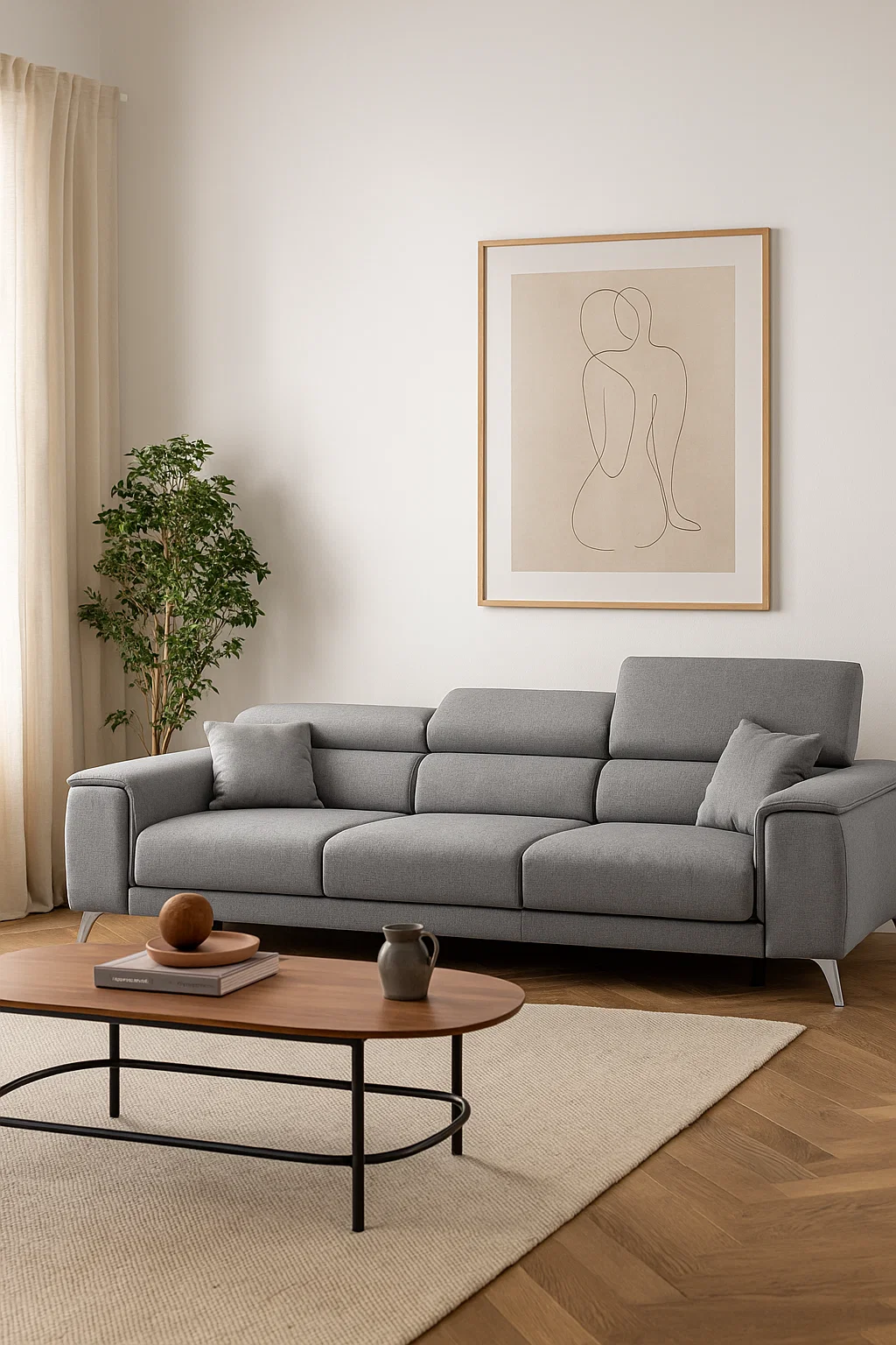 أريكه بثلاثة مقاعد من الخشب الطبيعي بتصميم عصري ومنحنيات ناعمة، تنجيد ناعم بلون محايد يضيف لمسة راقية ومريحة لأي مساحة معيشة.