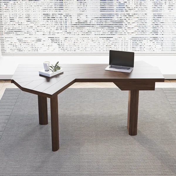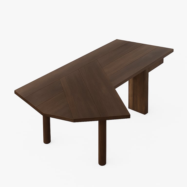 مكتب عصري على شكل ال مزود بسطحين غير منتظمين وأرجل من الخشب الطبيعي — صُمم للمتانة، الأناقة، والتخزين الذكي.