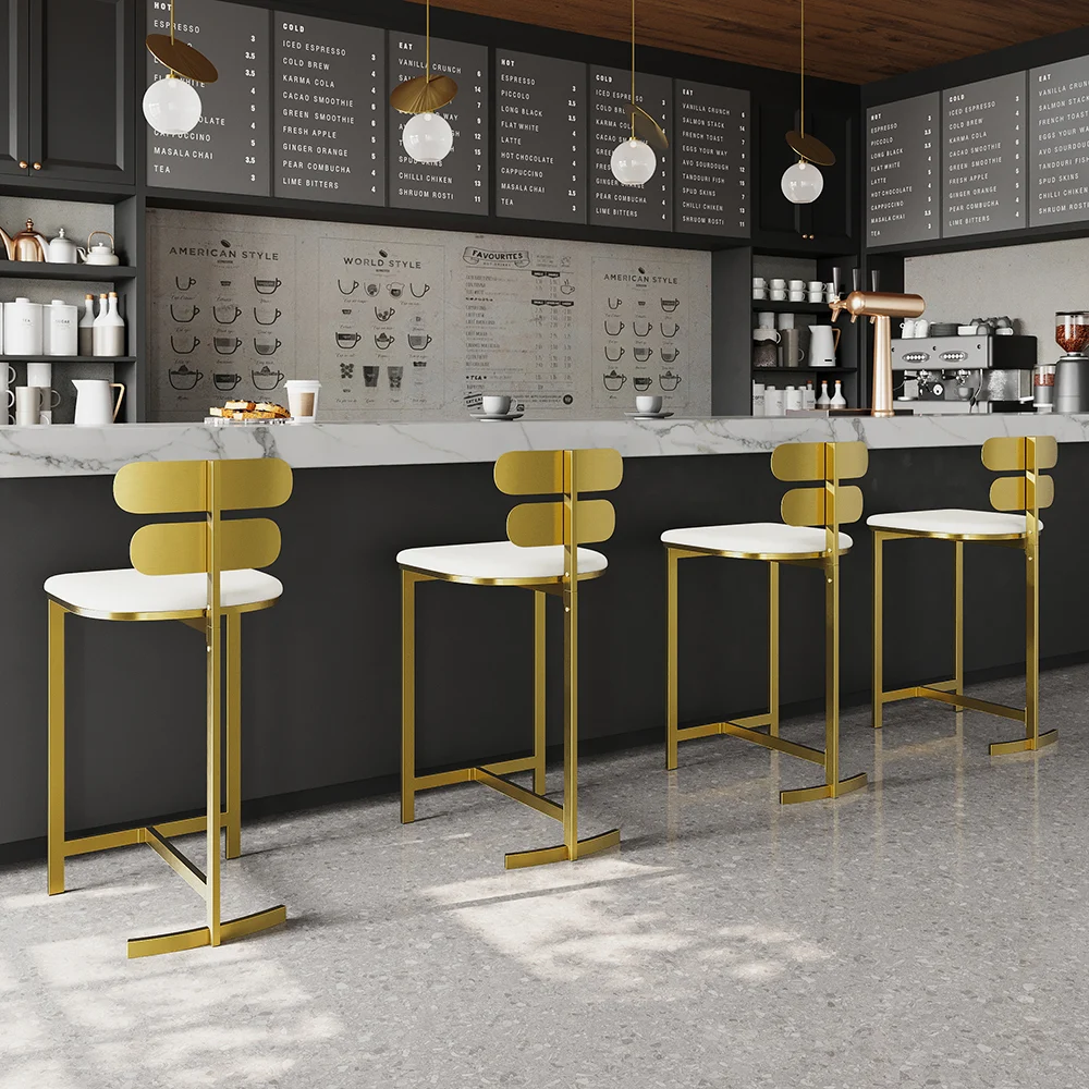 كرسي بار عصري يتميز بإطار من الستانلس ستيل المطلي بالذهب ومسند ظهر مبطن لراحة فاخرة وأسلوب عصري أنيق.
