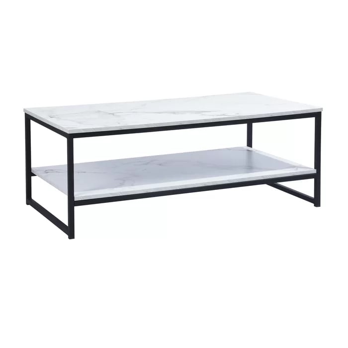 طاولة قهوة مستطيلة بطابقين تجمع بين الخشب الطبيعي والمعدن، توفر مظهرًا عصريًا أنيقًا ومساحة تخزين عملية تناسب ديكور غرفة المعيشة.