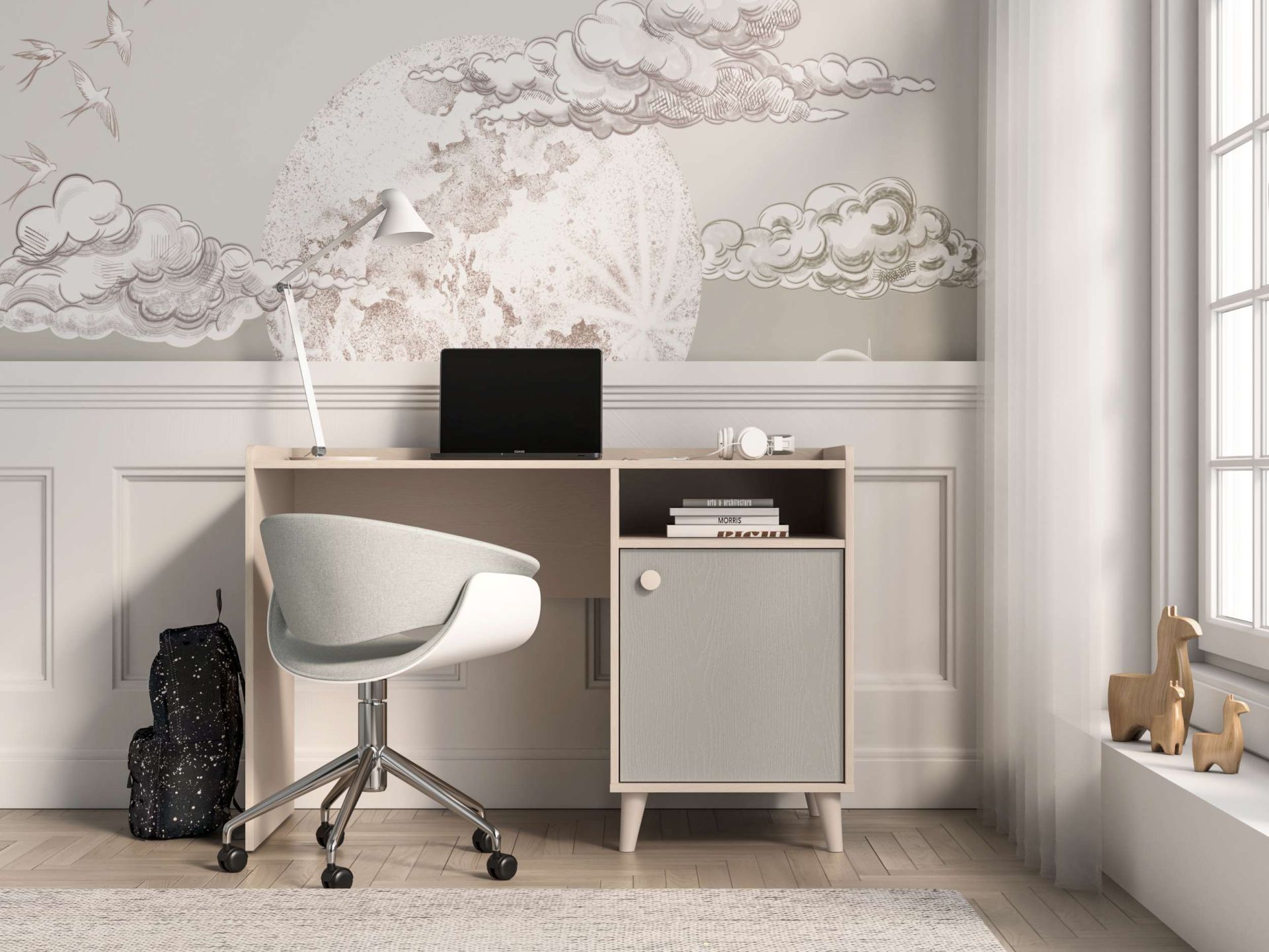 مكتب دراسة أنيق مصنوع من الخشب الطبيعي المتين، بتصميم عصري يوفر سطح عمل واسع، رف مفتوح للتخزين السريع، وخزانة جانبية بباب رمادي لتخزين المستلزمات المختلفة.