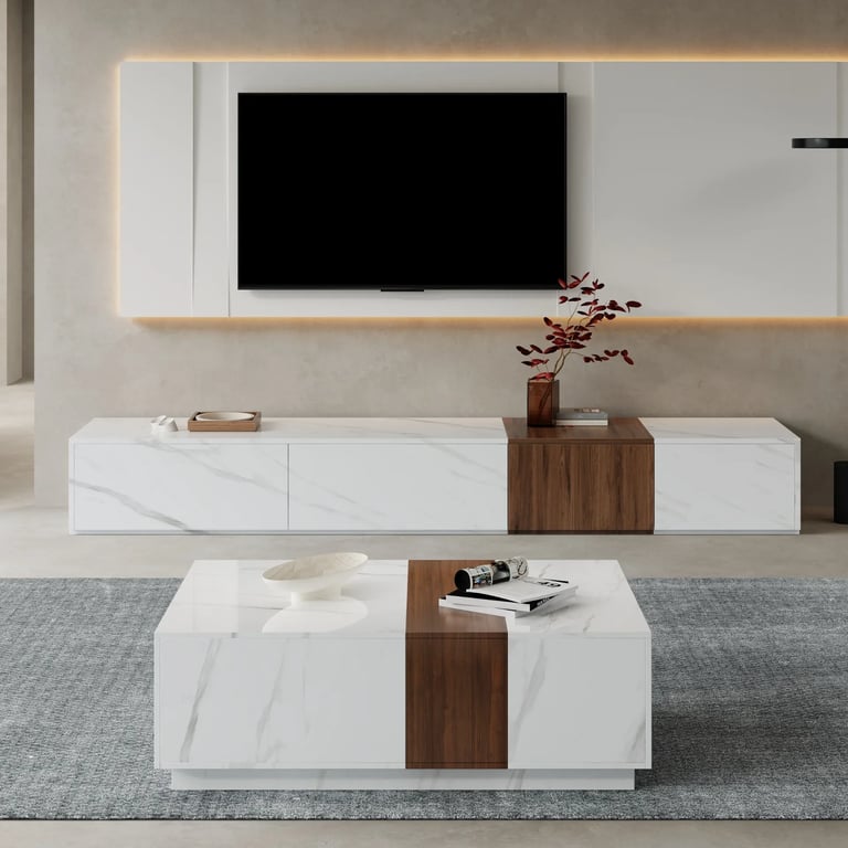 الرئيسية المتجر أثاث غرف المعيشة طقم غرفة معيشة متكامل ماركينا – وحدة تلفاز من الخشب الطبيعي و بديل الرخام مع طاولة قهوة متطابقة