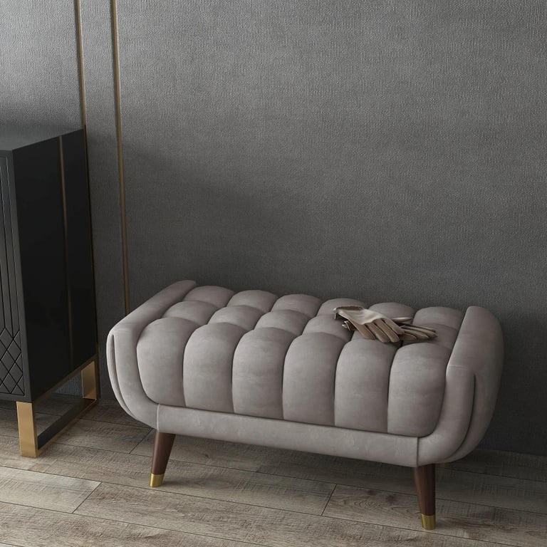 The Auriel bench combines luxury and comfort through its elegant tufted design and soft, premium velvet upholstery. Filled with high-density foam, it offers superior seating comfort, while the solid natural wood legs provide stability and warmth, enhanced by refined gold metal tips. Auriel is an ideal accent piece for living rooms, bedrooms, or entryways seeking both function and sophistication.