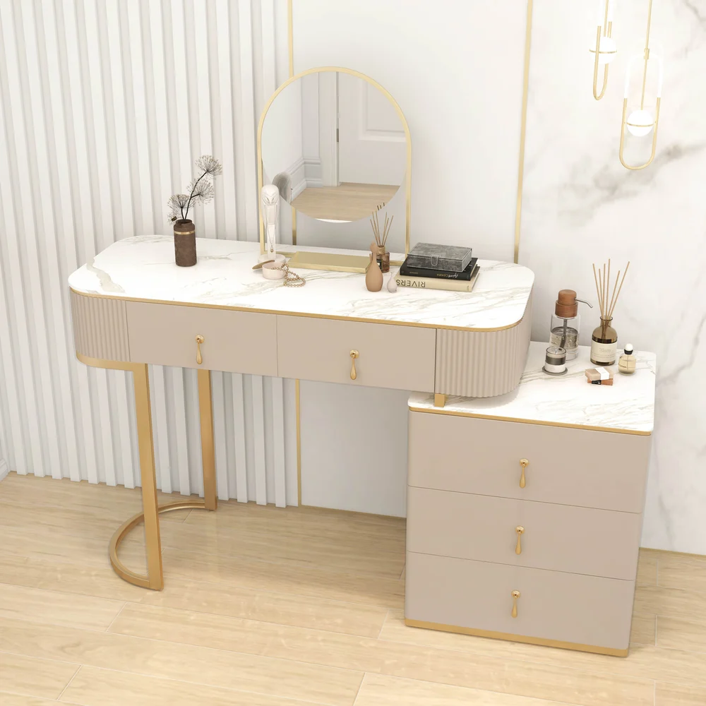 The Clarette vanity brings a touch of modern elegance to your space with its refined design crafted from high-quality natural wood and a gold stainless-steel frame resistant to water and rust. It perfectly balances beauty and functionality, featuring a smooth, durable top that’s easy to clean and spacious drawers for neatly organizing your cosmetics and accessories. With its flowing lines and subtle golden details, the Clarette vanity adds a sophisticated charm to any bedroom, completing your décor with a sense of balance and quiet luxury.