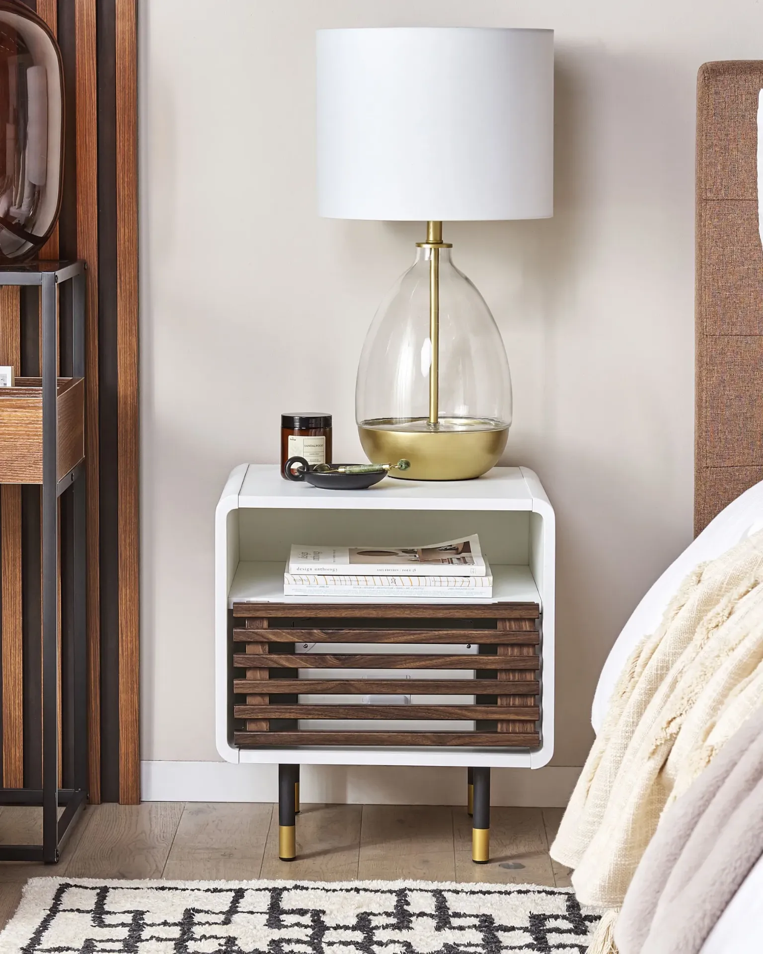 A sleek modern bedside table crafted from premium natural wood, featuring an open shelf and a spacious drawer for practical storage and everyday convenience.