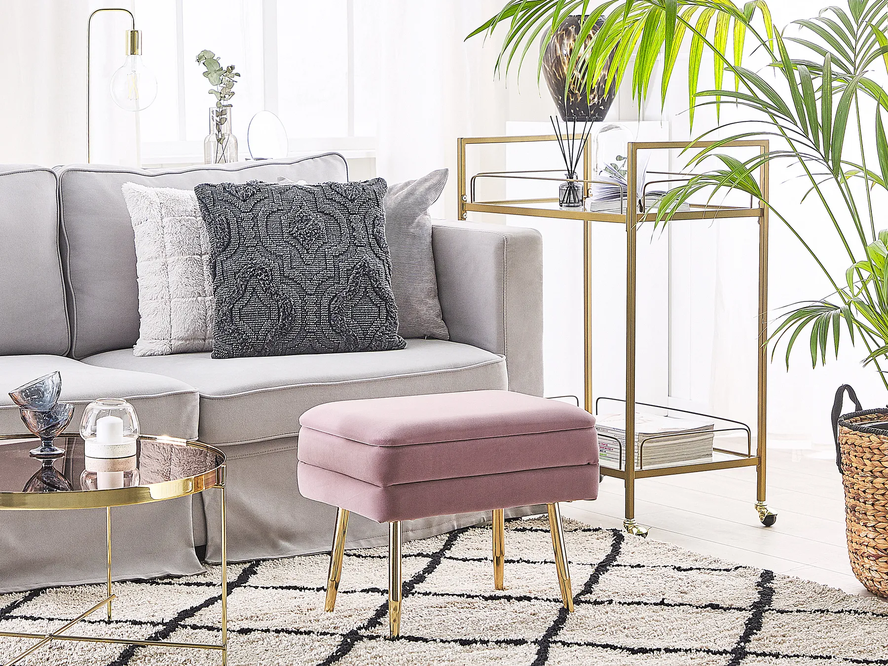 A luxurious ottoman with a sleek tufted design, upholstered in soft velvet and supported by elegant golden legs.