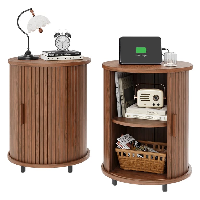 A round side table crafted from natural wood, combining elegant curves with hidden storage for a warm and functional touch.