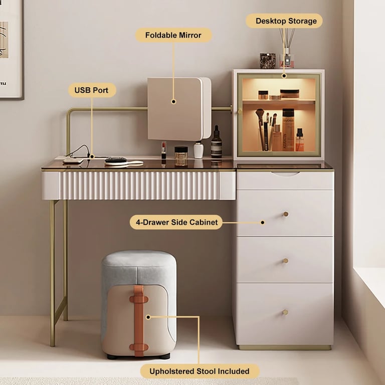 Elevate your beauty routine with the Marvella Vanity Set — featuring a glass top, LED-lit storage cabinet, and sleek modern design that combines elegance with everyday functionality.