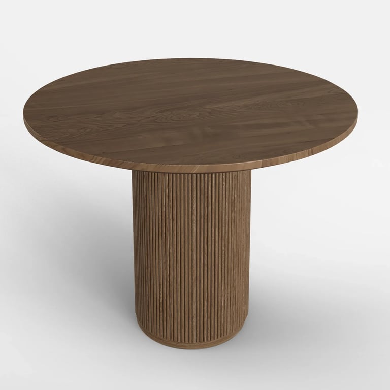 A sculptural round dining table with a fluted base and a smooth natural wood top—crafted for connection, elegance, and everyday warmth.