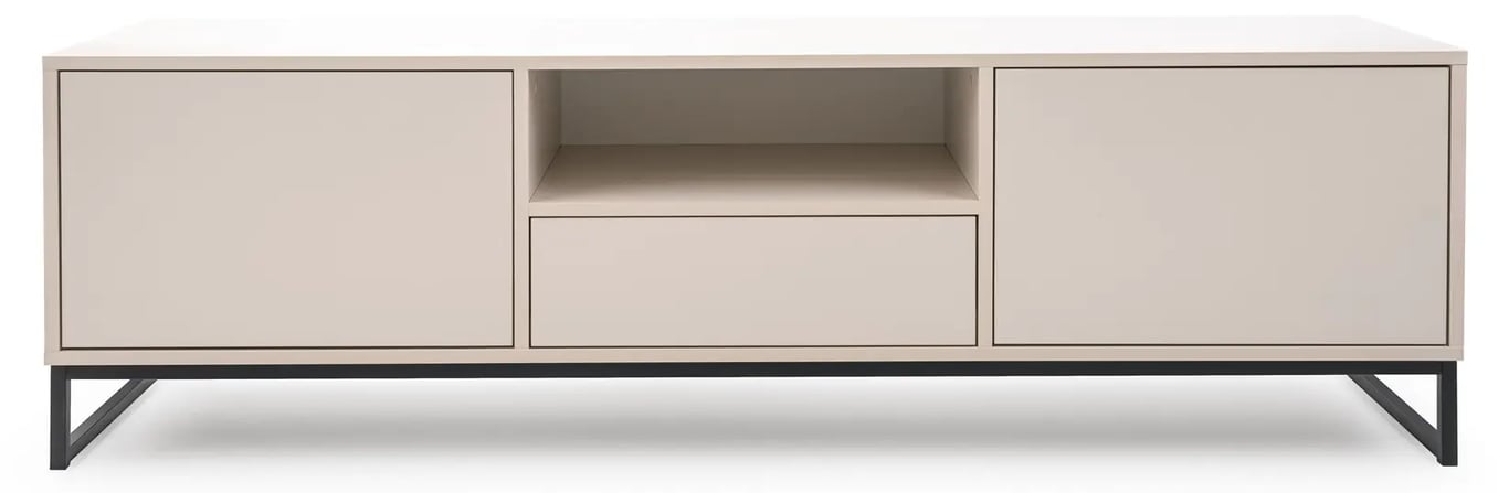 A refined media console crafted from natural wood, featuring fluted movable panels and distinctive rounded wooden legs for a modern, elegant living space.