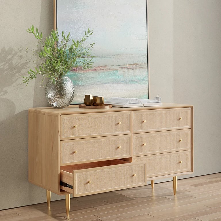 A refined media console crafted from natural wood, featuring fluted movable panels and distinctive rounded wooden legs for a modern, elegant living space.