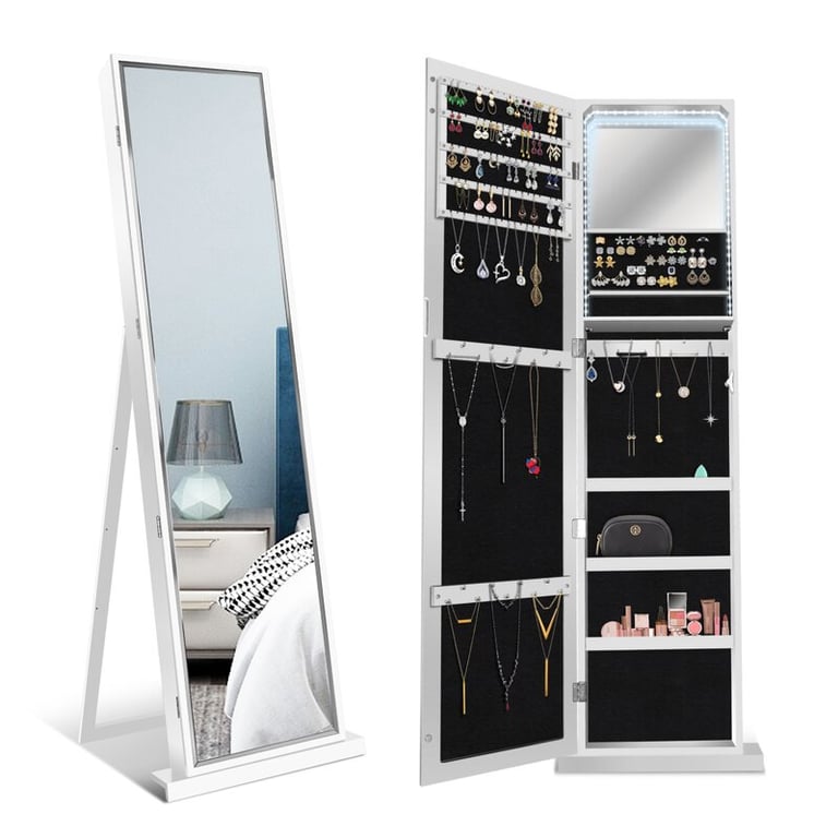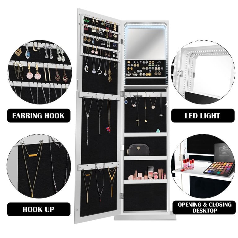 This wide armoire quickly gets all your jewellery properly organised and preserved in good condition, with 85 earring slots, 29 necklace and bracelet hooks, 60 ring slots, 1 pop-up shelf, and 3 drawers.