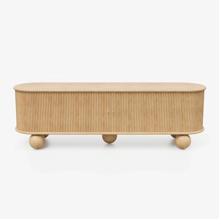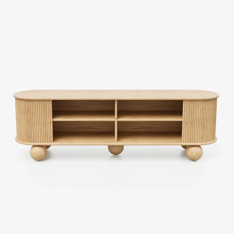 A refined media console crafted from natural wood, featuring fluted movable panels and distinctive rounded wooden legs for a modern, elegant living space.