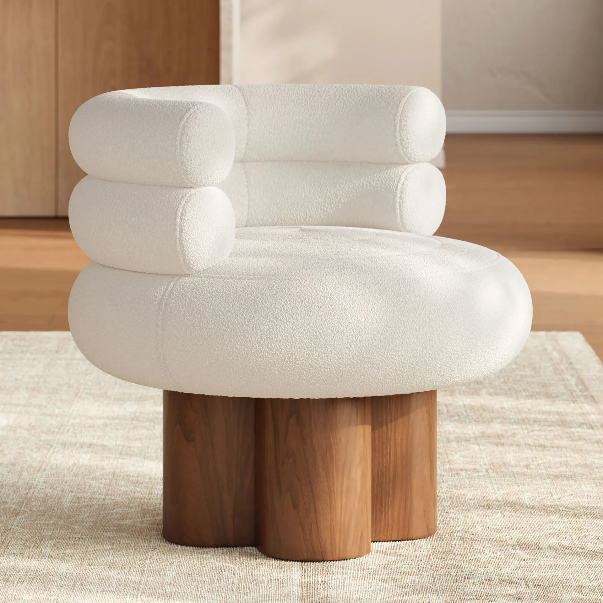 A distinctive shoe cabinet crafted from natural wood, featuring a unique circular slatted door design that blends artistic elegance with practical storage.