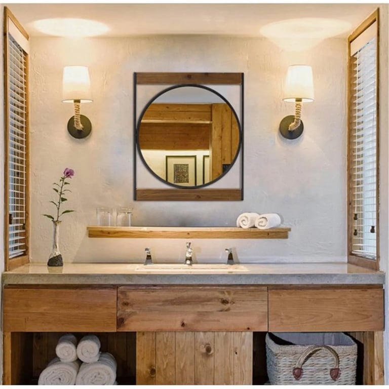 Add a touch of charm to your home decor with our round wall mirror with a square wooden and metal frame. Perfect for entryway, and bathroom. this mirror adds a modern and sophisticated look to your home.
