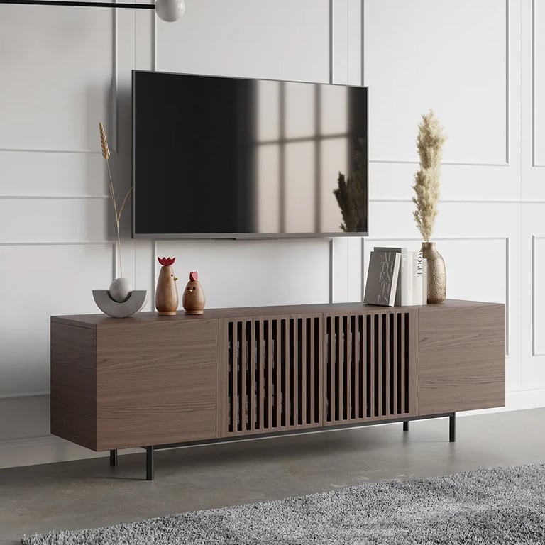 A refined media console crafted from natural wood, featuring fluted movable panels and distinctive rounded wooden legs for a modern, elegant living space.