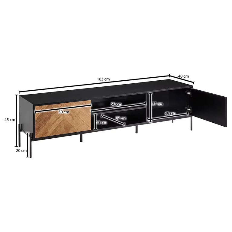 Make a bold impact with the Tressa TV unit —featuring a matte black finish and chevron-patterned doors for striking modern style. With hidden cabinets, open shelves, and smart cable management, it’s built for sleek, clutter-free living.
