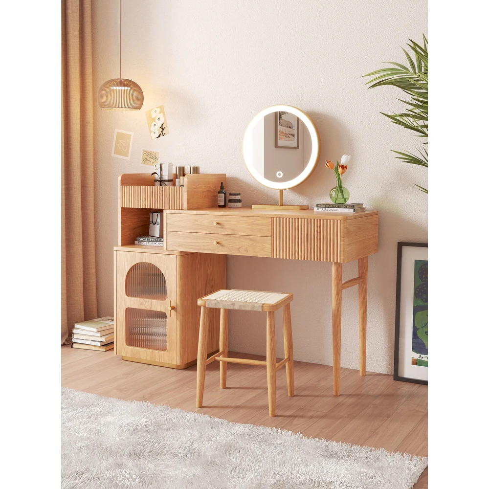 Léonie Vanity Set – Natural Wood with LED Mirror, Chair, and Storage Drawers